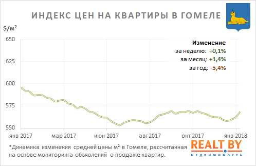 Средняя цена предложения в объявлениях о продаже квартир в Гомеле на минувшей неделе выросла на 1% и составила 569 $/м2.