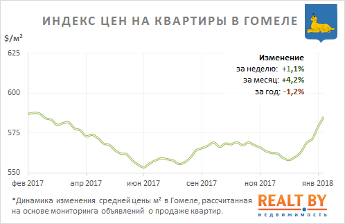 Средняя цена предложения в объявлениях о продаже квартир в Гомеле на минувшей неделе выросла на 1,1% и составила 585 $/м2.