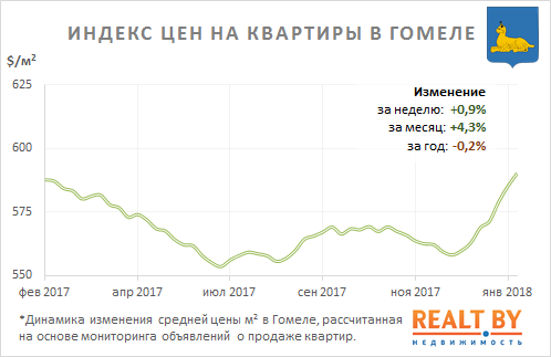 Средняя цена предложения в объявлениях о продаже квартир в Гомеле на минувшей неделе выросла на 0,9% и составила 590 $/м2.