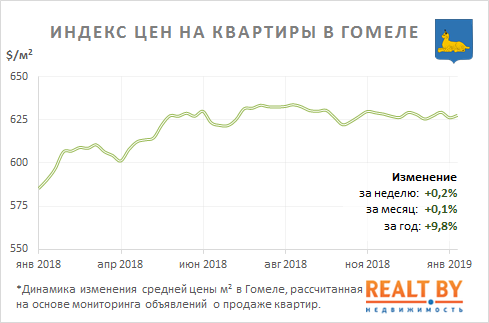 Средняя цена предложения в объявлениях о продаже квартир в Гомеле на минувшей неделе выросла на 0,2% и составила 628 $/м2.