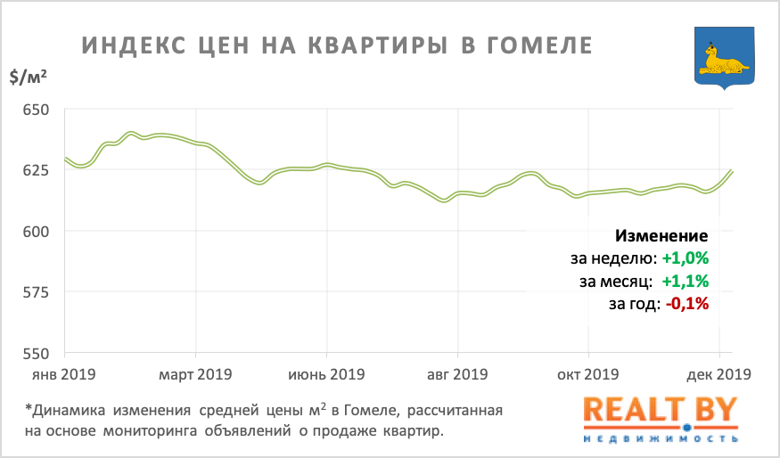 Средняя цена предложения в объявлениях о продаже квартир в Гомеле на минувшей неделе выросла на 1% и составила 625 $/м2.