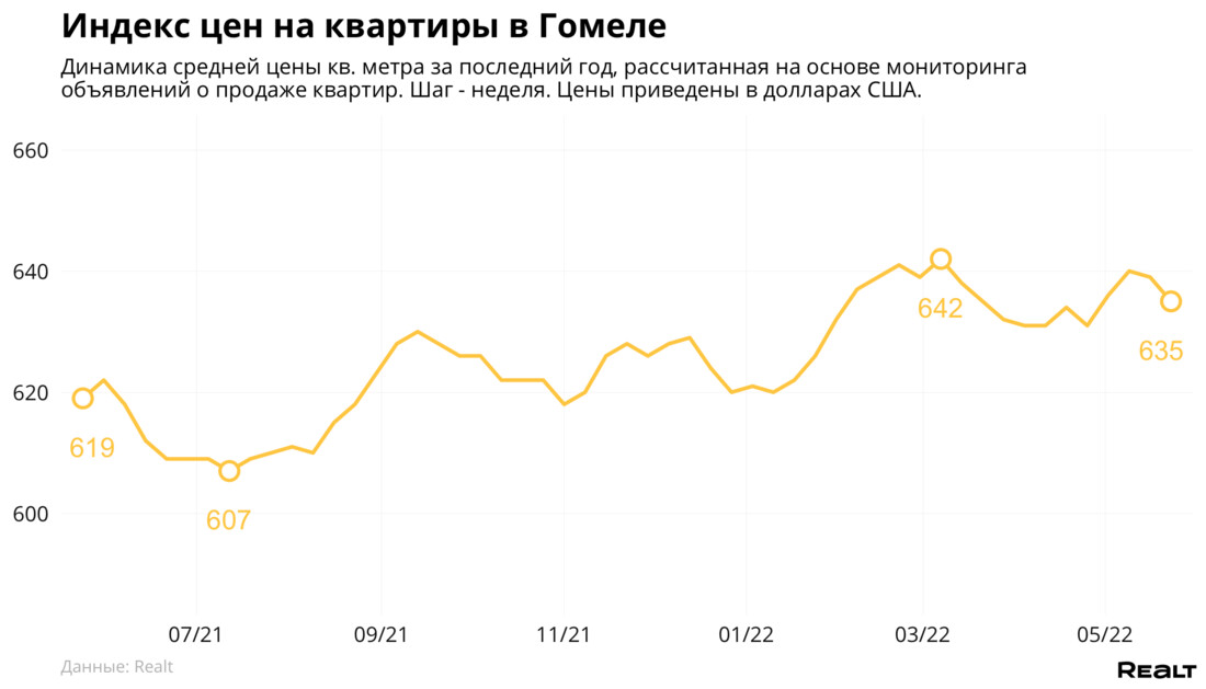 Средняя цена в объявлениях о продаже квартир в Гомеле снизилась на 0.6% и составила 635 $/м2.
