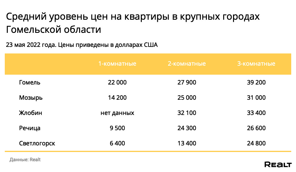 Мониторинг цен предложения квартир в Гомеле и городах Гомельской области за 16−23 мая 2022 года