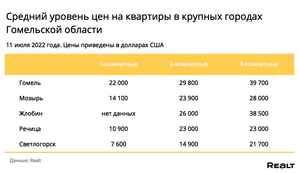 Мониторинг цен предложения квартир в Гомеле и городах Гомельской области за 4−11 июля 2022 года