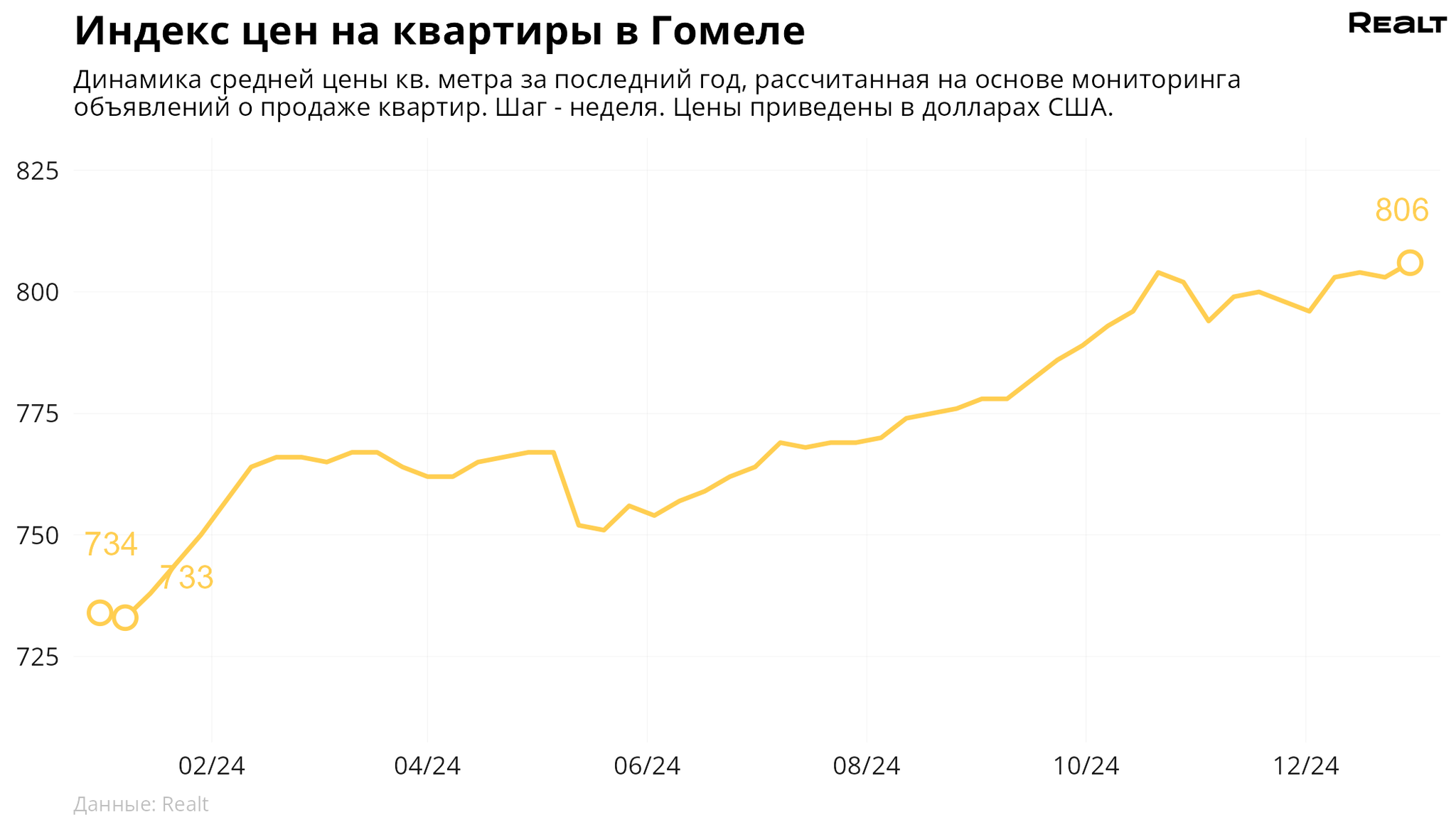 За неделю, с 23 по 30 декабря 2024 года, средняя цена в объявлениях о продаже квартир в Гомеле выросла на 0.4% и составила 806 $/м2. При этом количество квартир в продаже уменьшилось на 1.8%. Что еще произошло на рынке жилья крупнейших городов Гомельской области за семь дней — в материале.