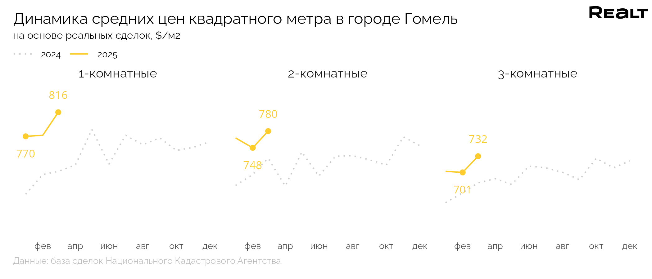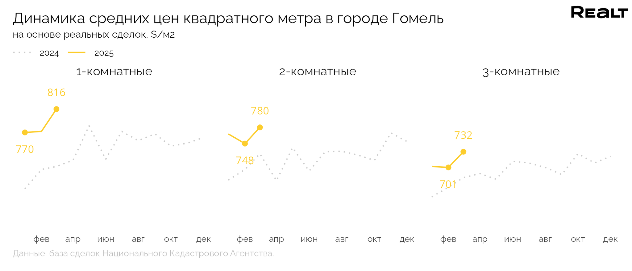 Средняя цена квадратного метра квартир в Гомеле в сделках за месяц увеличилась на 5.4% и составила 820 $/м2. Текущий уровень цен на 15% выше, чем в аналогичный период прошлого года. При этом текущий уровень цен — максимальный за последние 10 лет.
