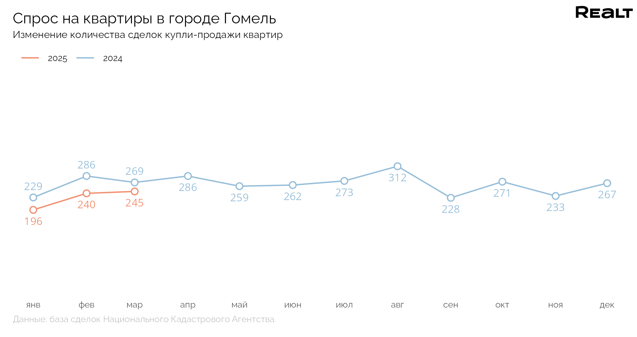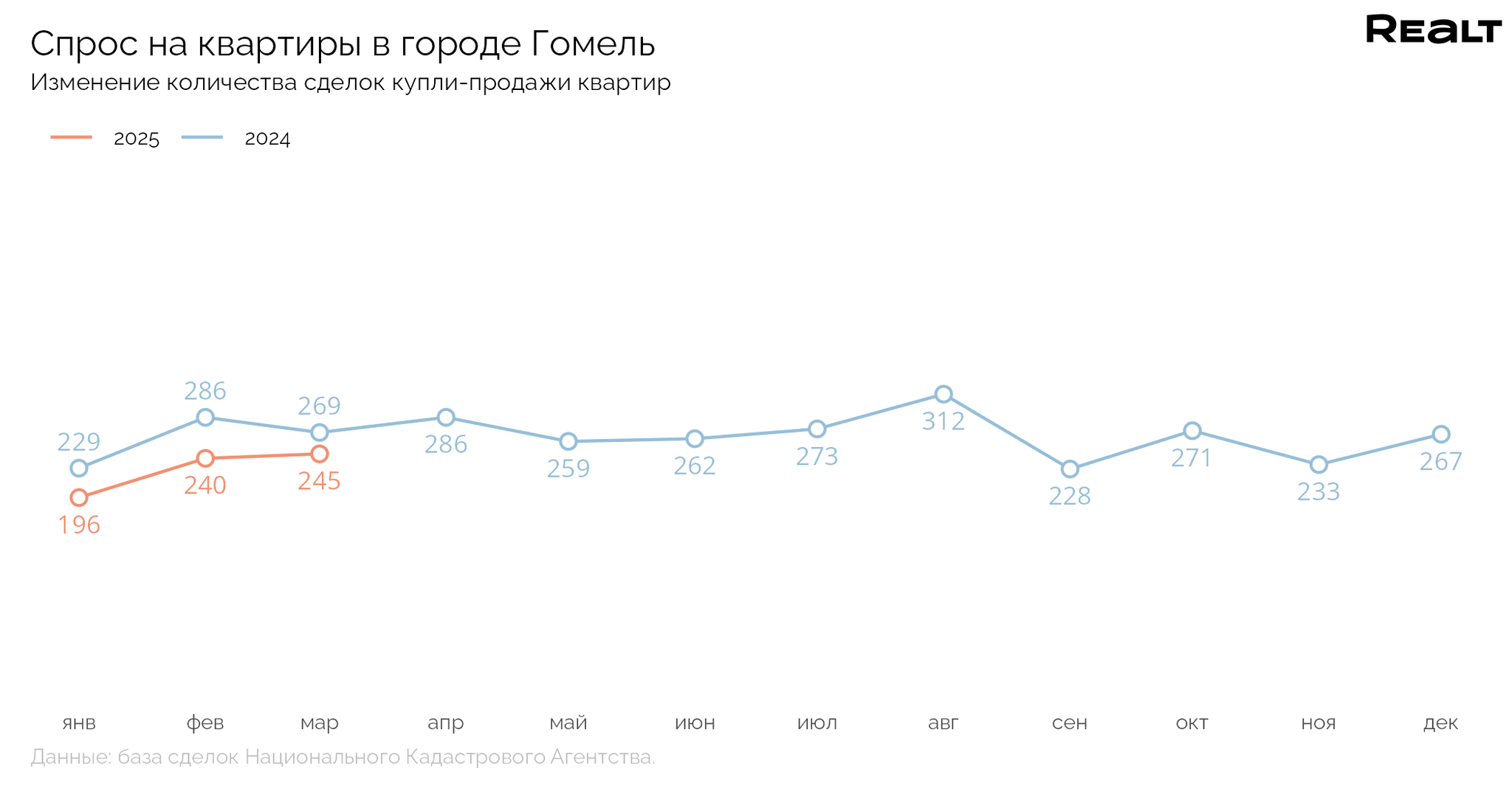 За март в Гомеле заключили 245 сделок купли-продажи квартир, что на 2% больше, чем в предыдущем месяце. При этом текущий уровень спроса один из максимальных для этого месяца. Больше сделок было в 2019 и 2024 годах, когда их было заключено на 13% и 10% больше.