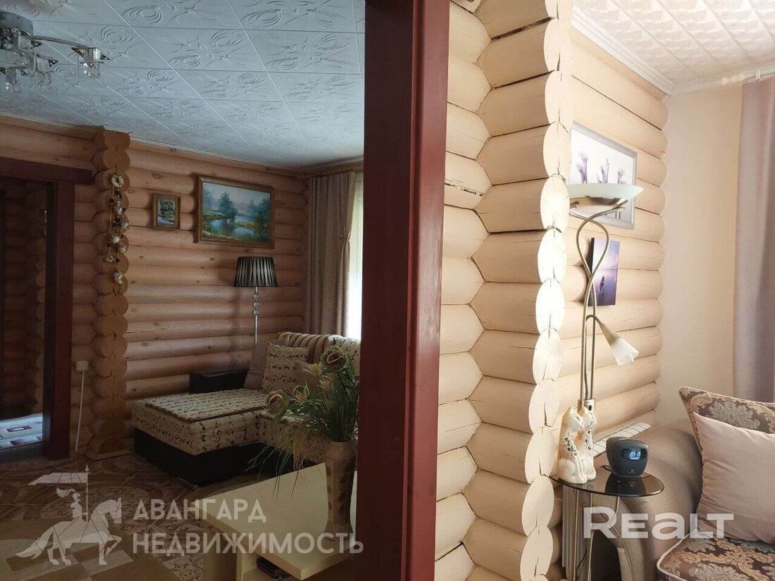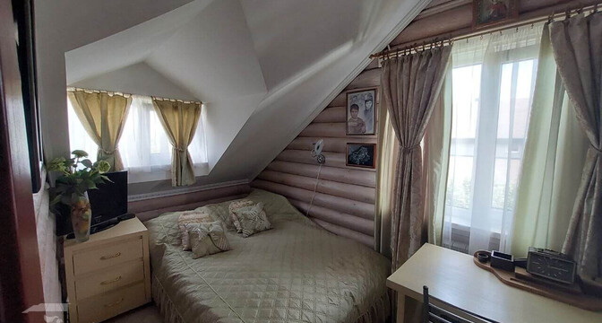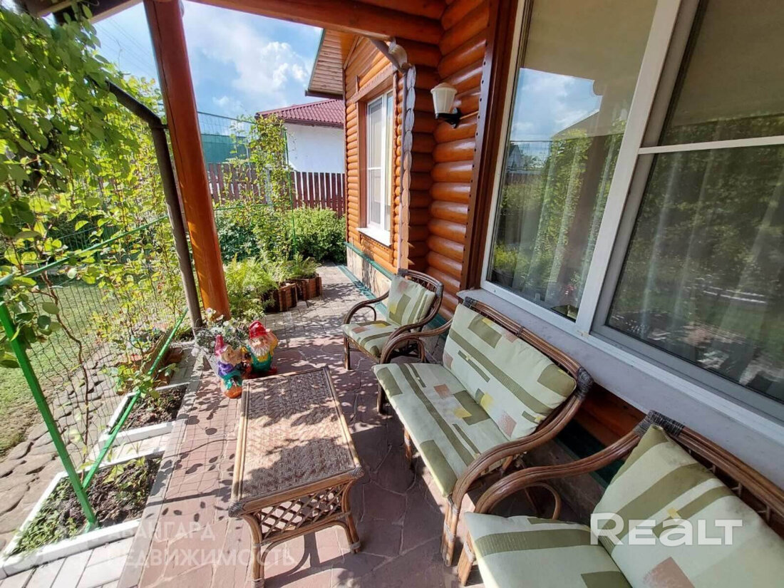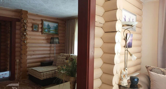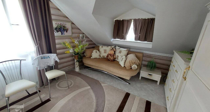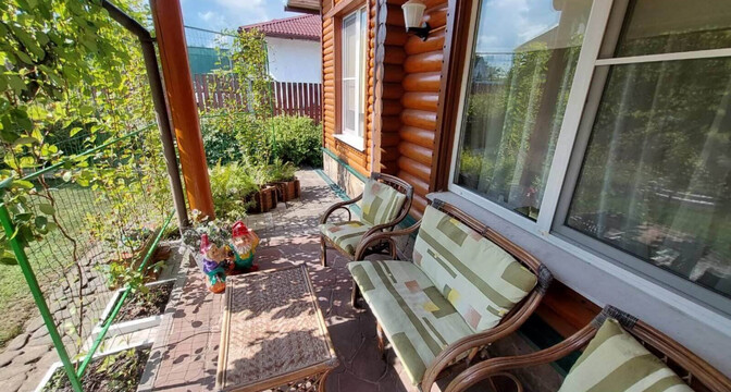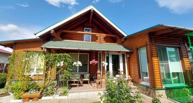 Самый дорогой вариант — двухэтажный бревенчатый дом площадью 130 квадратов. В доме пять комнат, гостиная, кухня с французскими окнами и санузел. Отопление газовое, водоснабжение центральное, канализация — септик. Площадь участка — 8 соток. Есть баня, беседка, теплица и зона для гриля.
