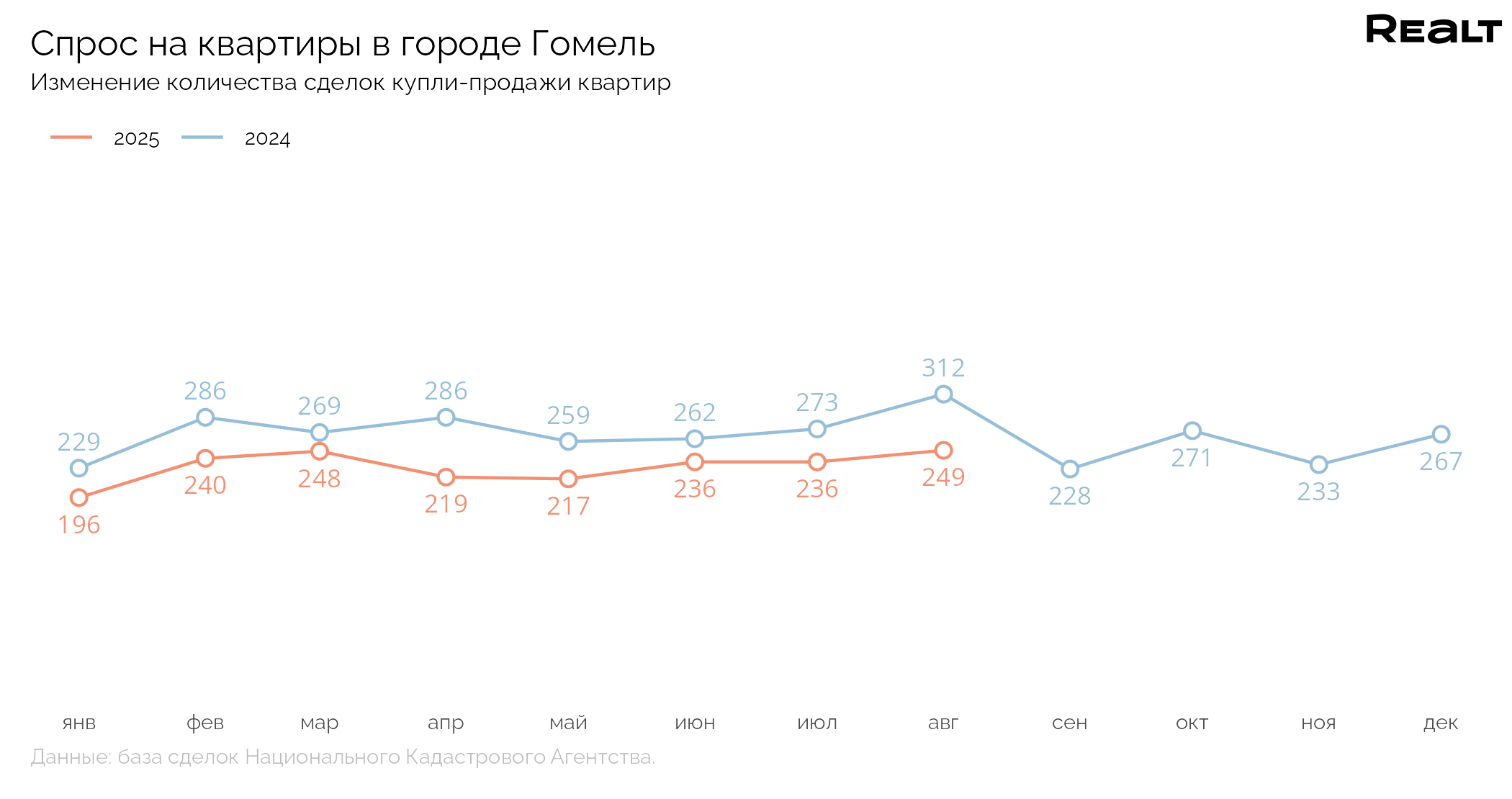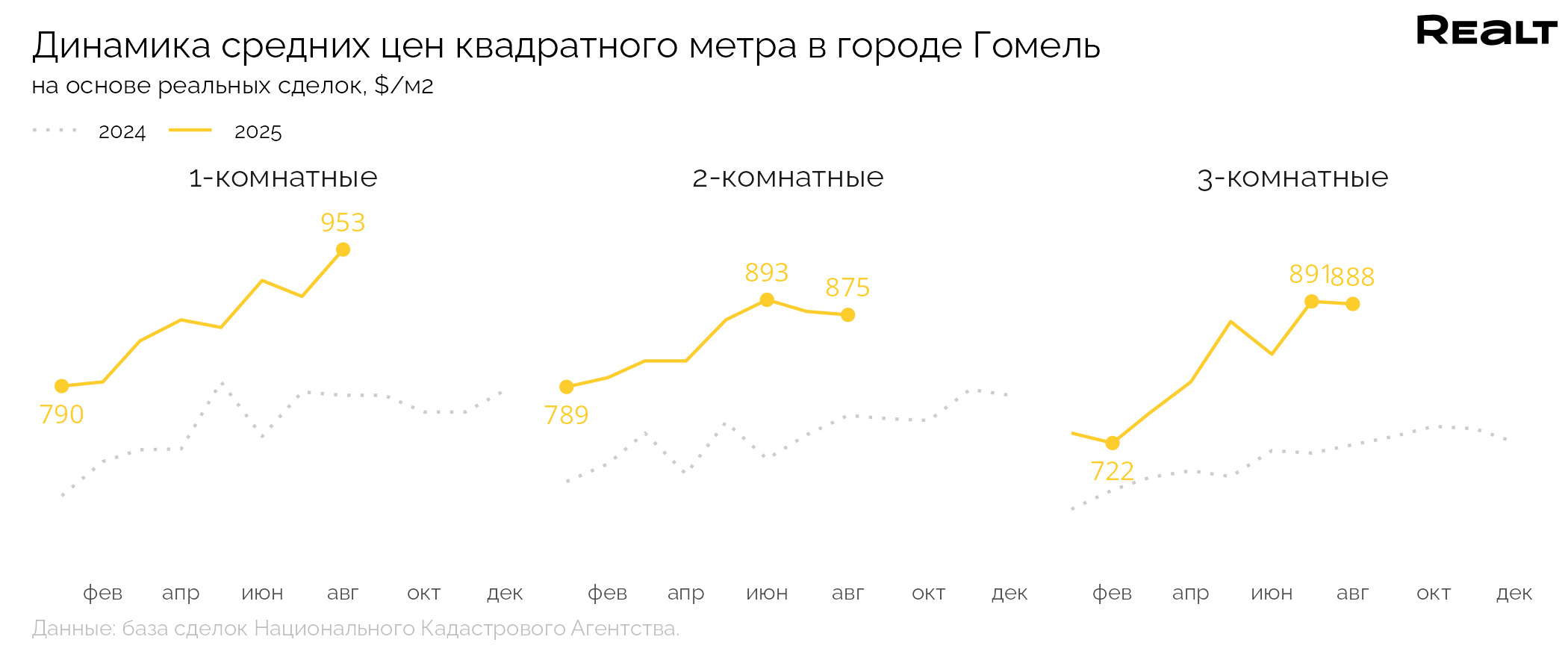 Средняя цена квадратного метра квартир в Гомеле в сделках за месяц увеличилась на 1.9% и составила 900 $/м2. Текущий уровень цен на 19.4% выше, чем в аналогичный период прошлого года.