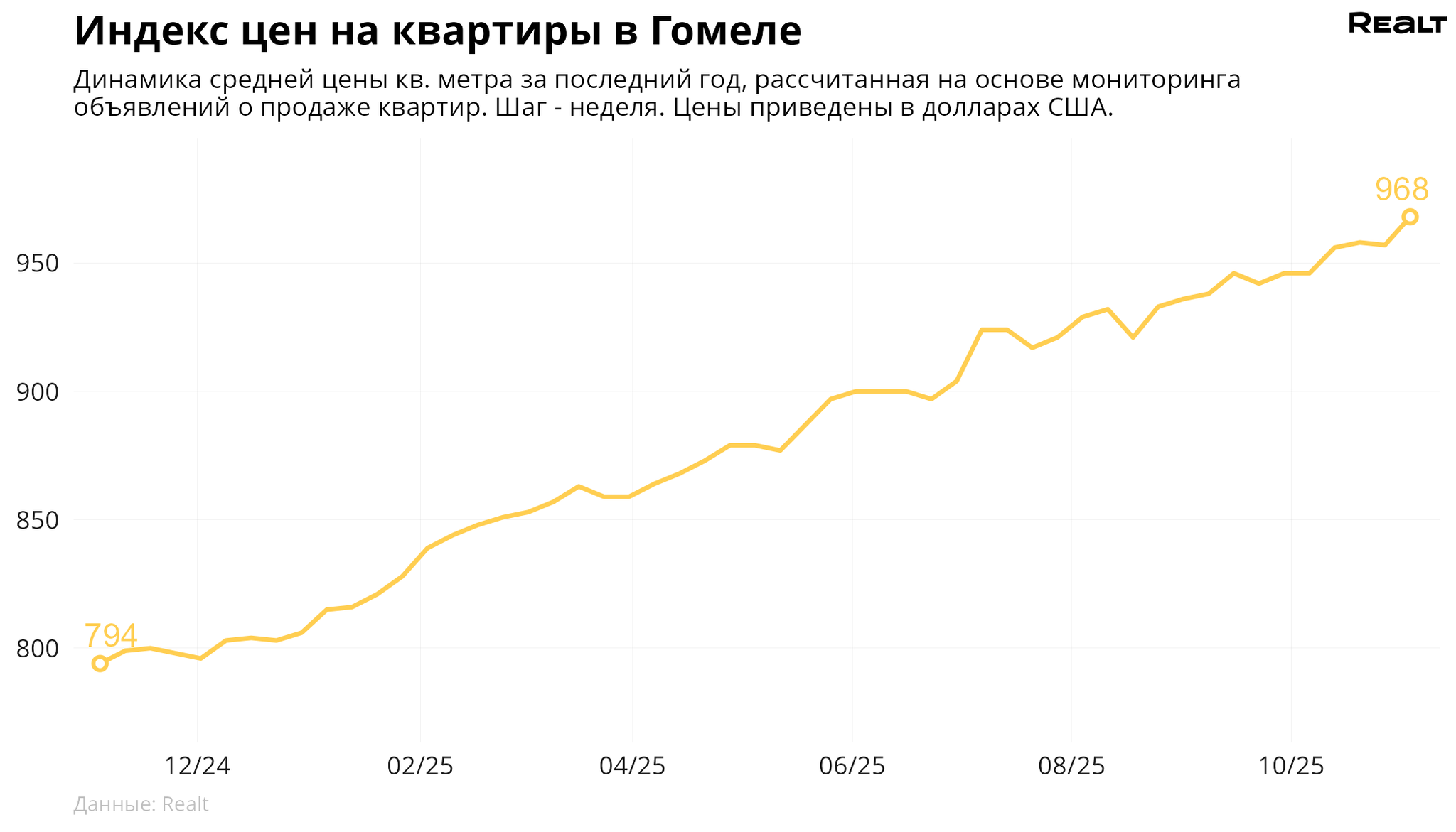 За неделю, c 27 октября по 3 ноября 2025 года, средняя цена в объявлениях о продаже квартир в Гомеле выросла на 1.1% и составила 968 $/м2. При этом количество квартир в продаже уменьшилось на 0.5%. Что еще произошло на рынке жилья крупнейших городов Гомельской области за семь дней — в материале.