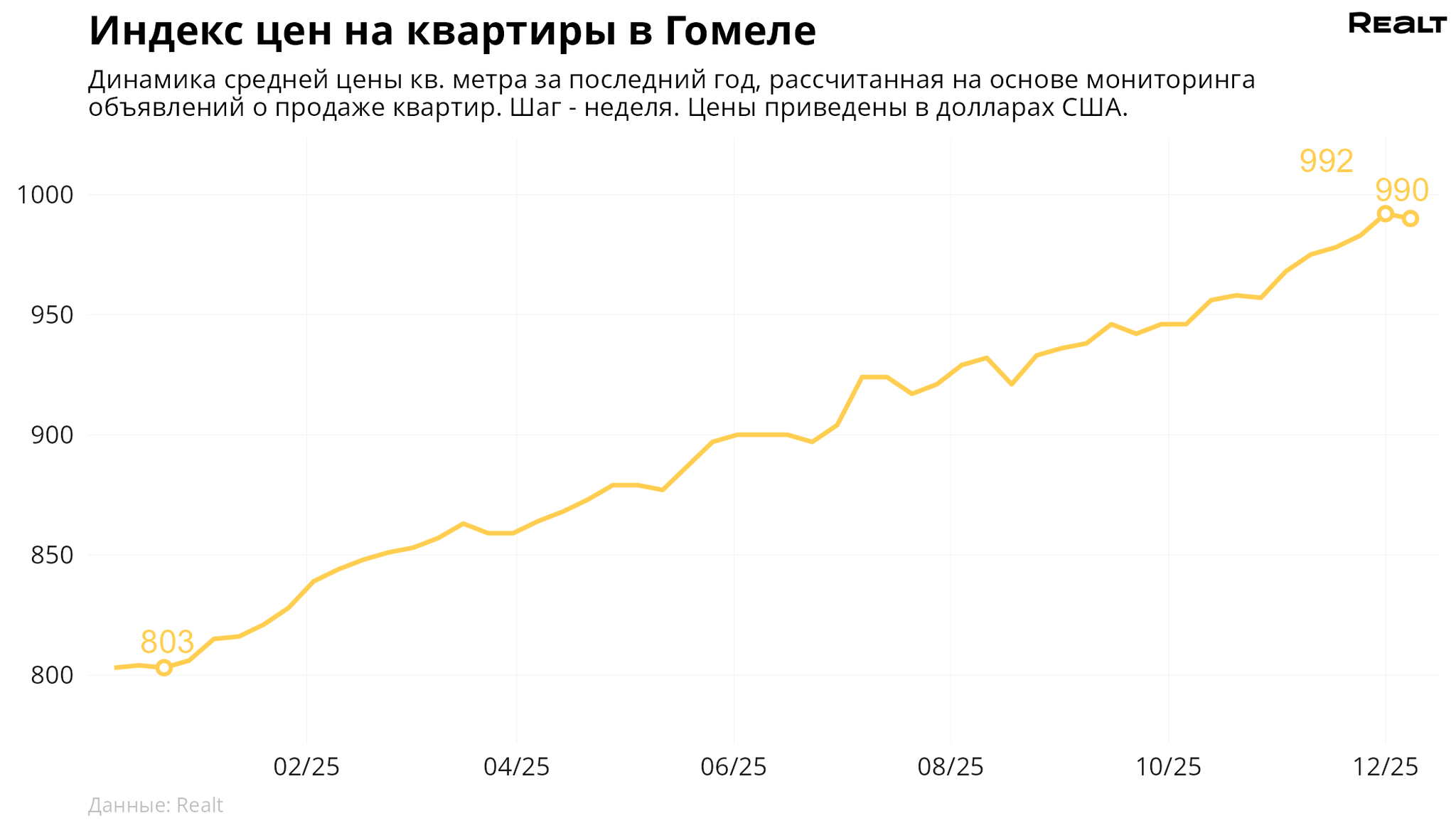 За неделю, с 1 по 8 декабря 2025 года, средняя цена в объявлениях о продаже квартир в Гомеле снизилась на 0.2% и составила 990 $/м2. При этом количество квартир в продаже увеличилось на 1.3%. Что еще произошло на рынке жилья крупнейших городов Гомельской области за семь дней — в материале.