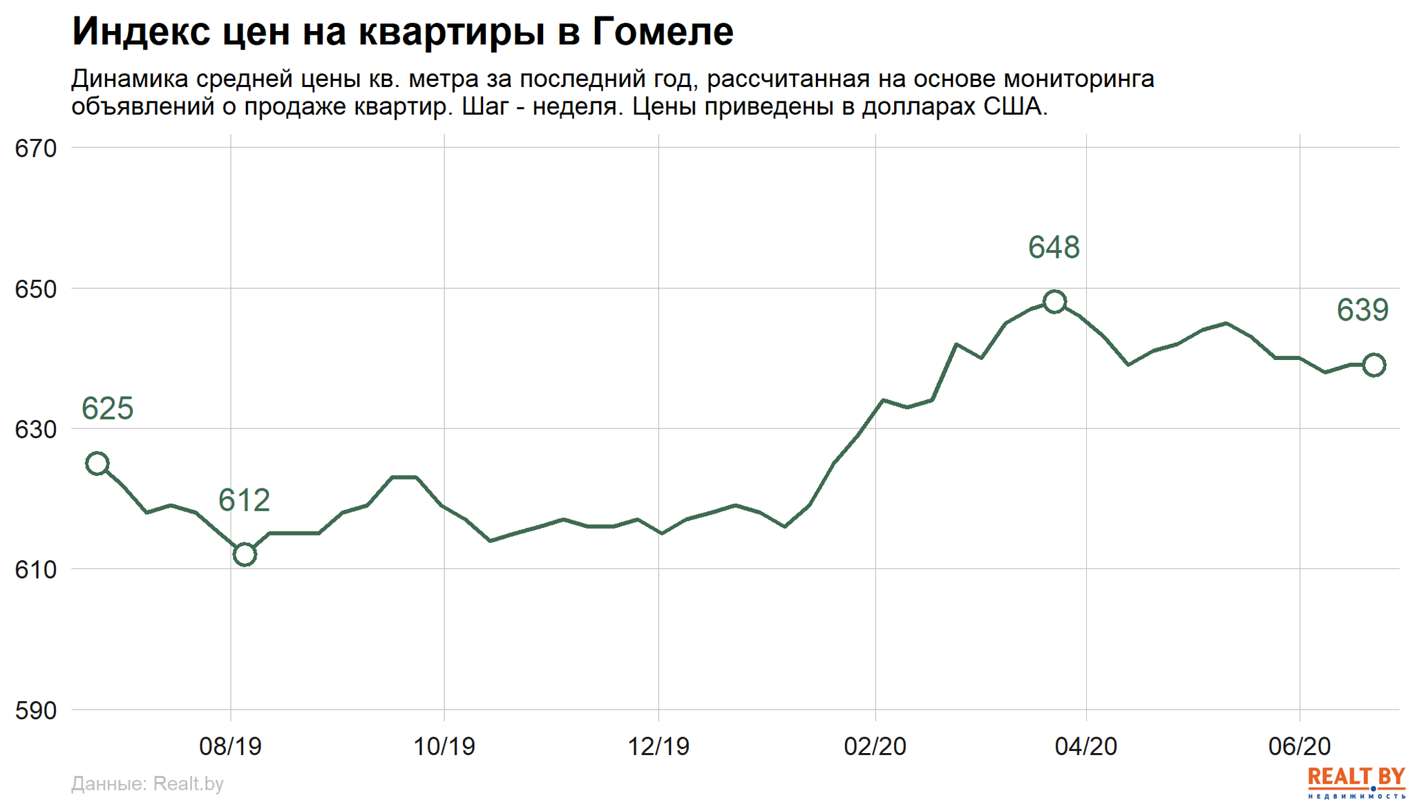 Средняя цена в объявлениях о продаже квартир в Гомеле не изменилась и составила 639 $/м2.