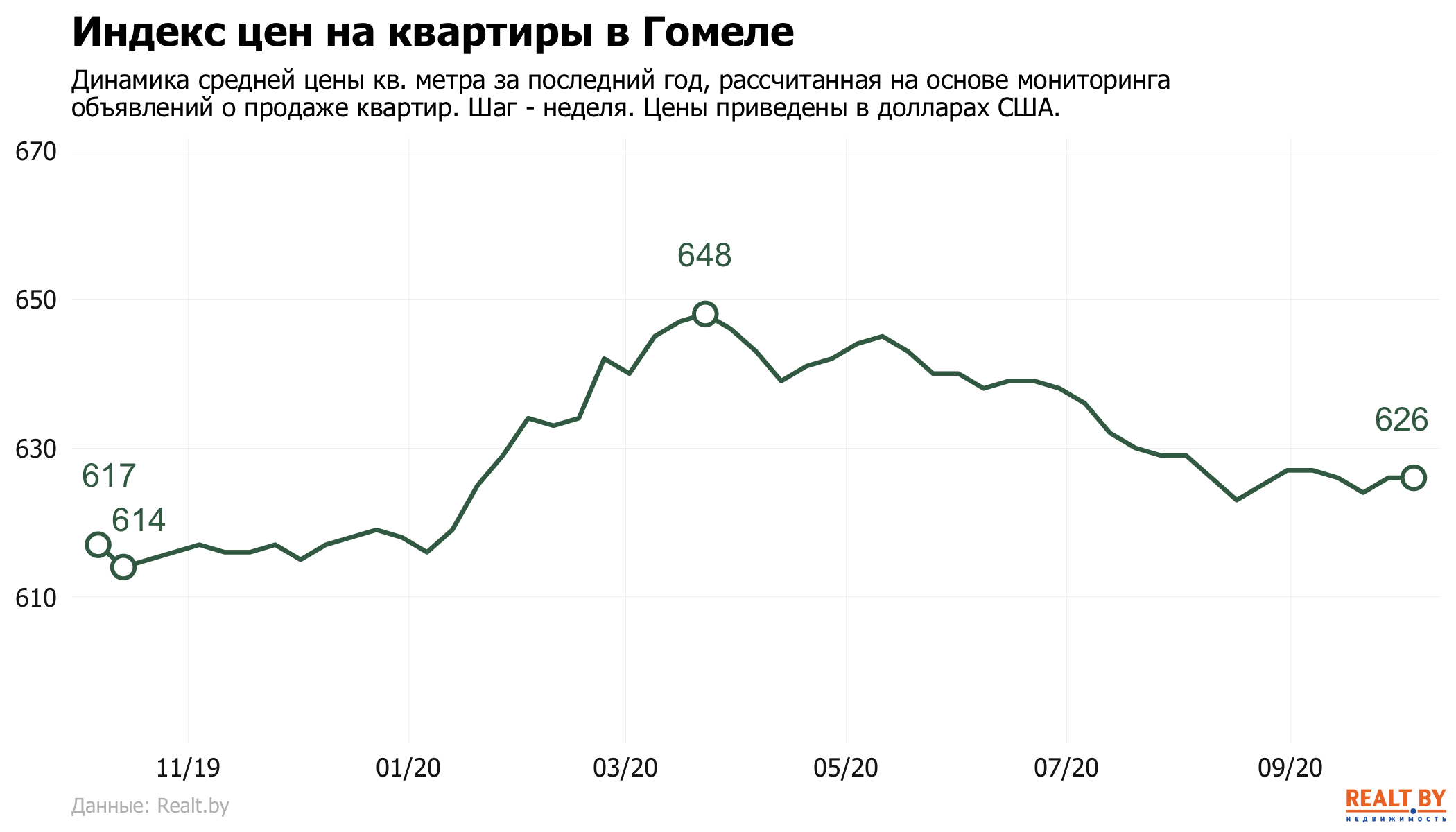 Средняя цена в объявлениях о продаже квартир в Гомеле не изменилась и составила 626 $/м2.
