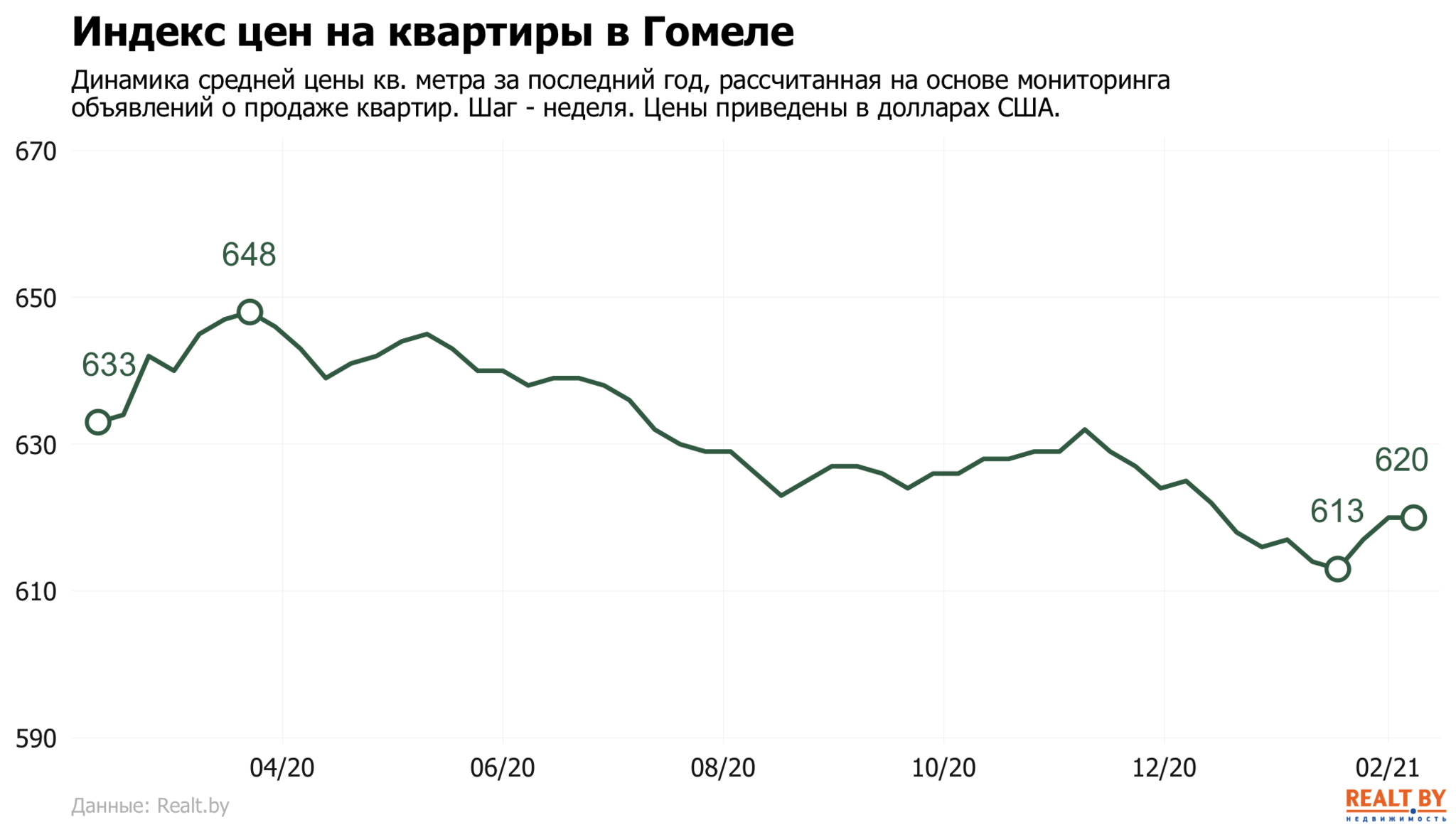 Средняя цена в объявлениях о продаже квартир в Гомеле не изменилась и составила 620 $/м2.