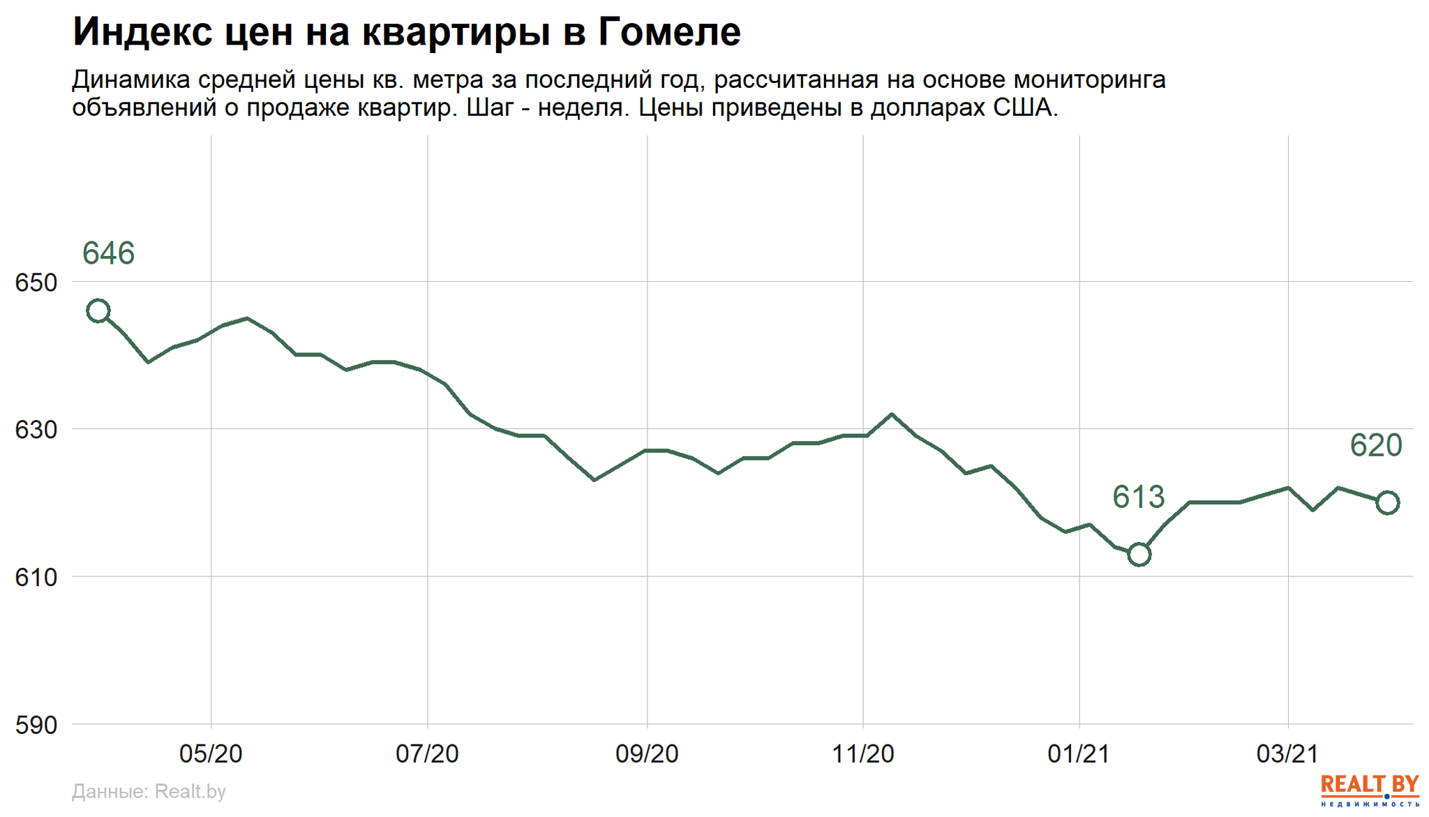 Средняя цена в объявлениях о продаже квартир в Гомеле снизилась на 0.2% и составила 620 $/м2.