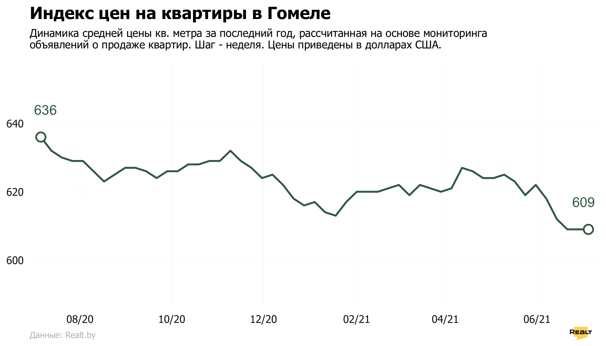 Средняя цена в объявлениях о продаже квартир в Гомеле не изменилась и составила 609 $/м2.