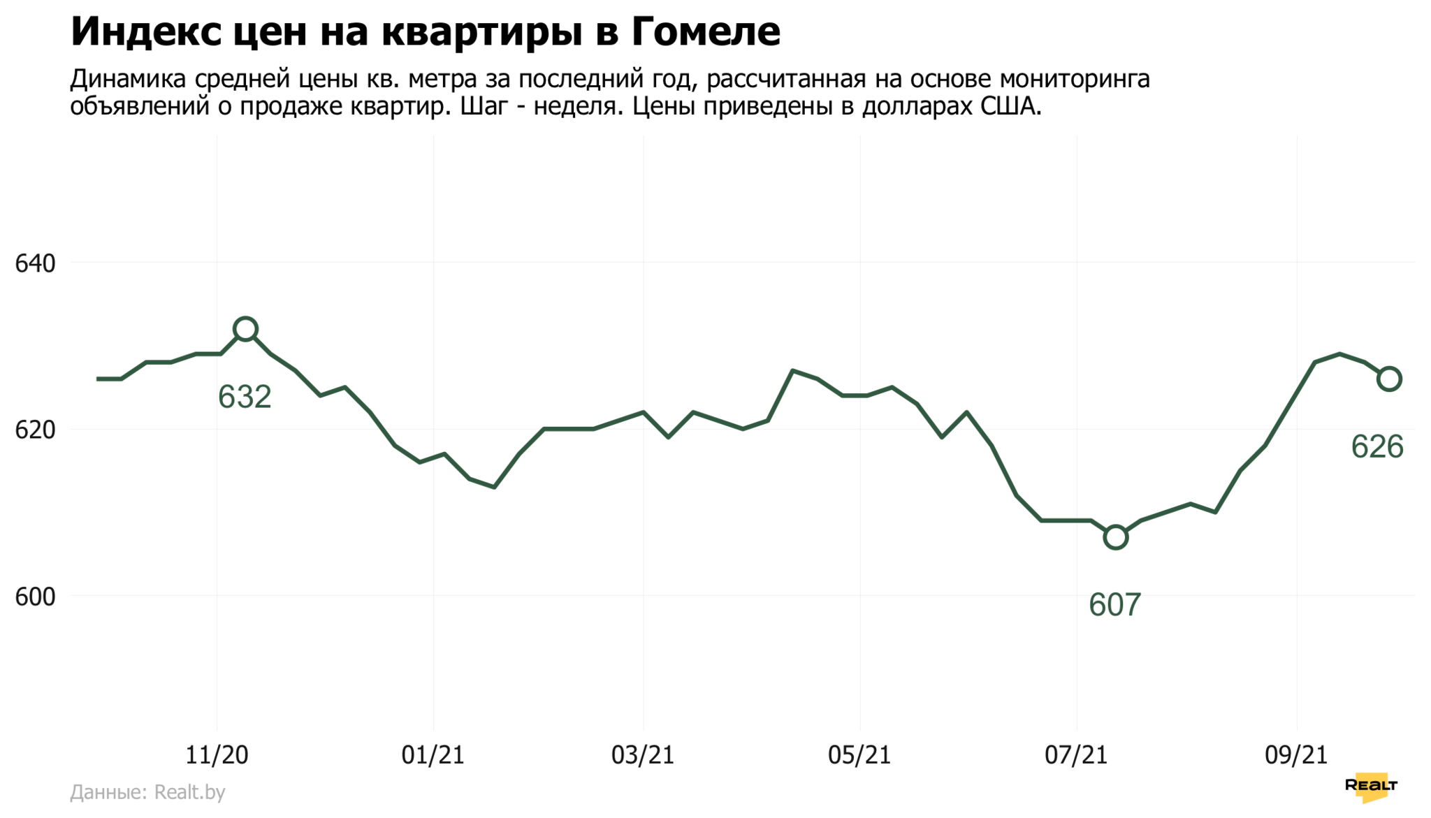 На 0.5% снизилась средняя цена предложения квартир в Мозыре — до 504 $/м2. В Жлобине квартиры продавались в среднем за 519 $/м2 (+1.1% за неделю). В Речице средняя цена квадратного метра в объявлениях о продаже квартир составила 445 $ (-0.3%). За квартиры в Светлогорске просят в среднем 287 $/м2 (-0.1%).