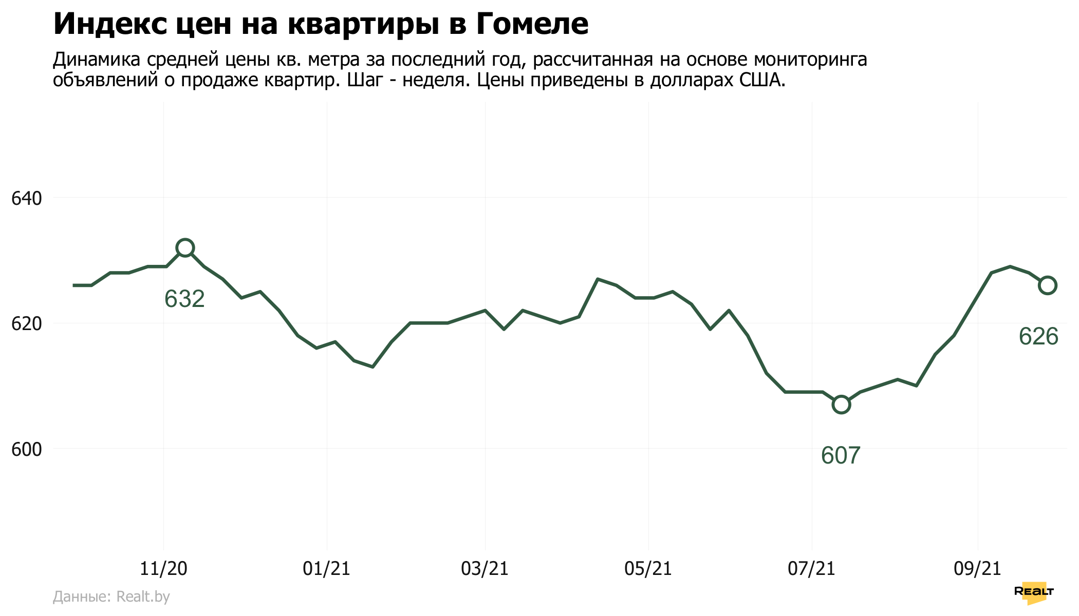 Средняя цена в объявлениях о продаже квартир в Гомеле снизилась на 0.3% и составила 626 $/м2.