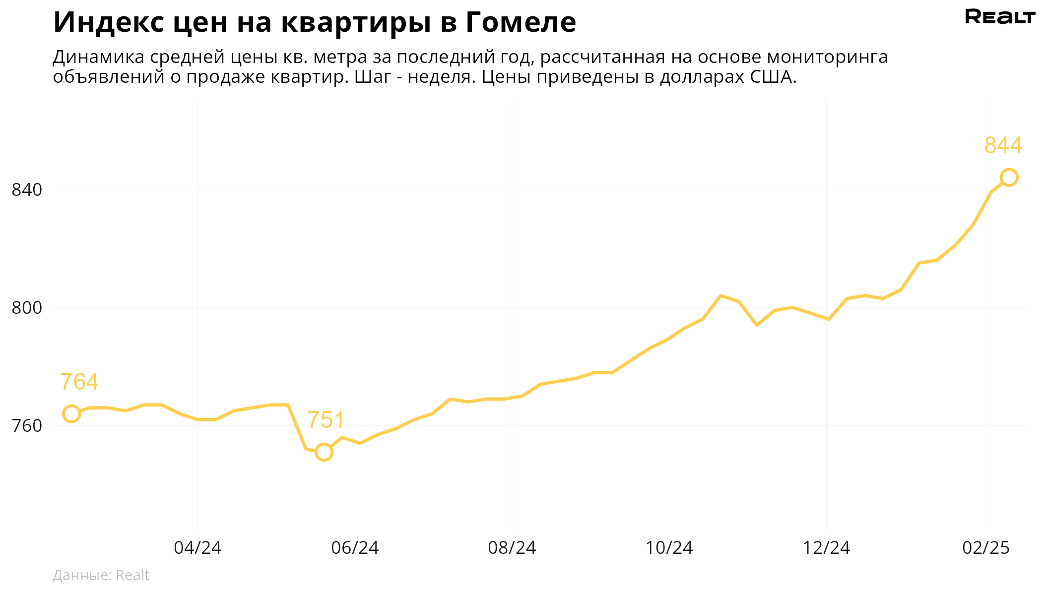 За неделю, с 3 по 10 февраля 2025 года, средняя цена в объявлениях о продаже квартир в Гомеле выросла на 0.6% и составила 844 $/м2. При этом количество квартир в продаже увеличилось на 0.9%. Что еще произошло на рынке жилья крупнейших городов Гомельской области за семь дней — в материале.