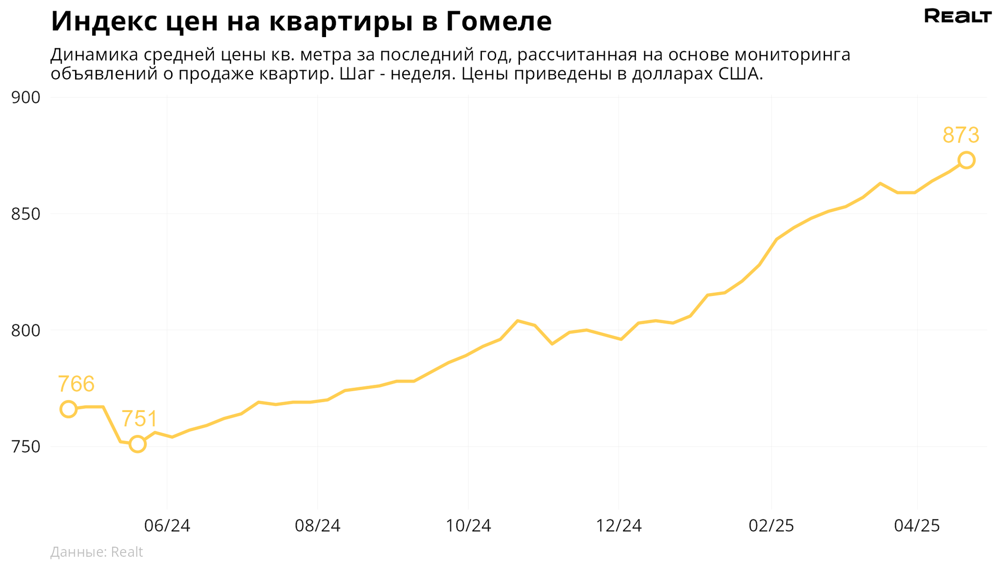 За неделю, с 14 по 21 апреля 2025 года, средняя цена в объявлениях о продаже квартир в Гомеле выросла на 0.6% и составила 873 $/м2. При этом количество квартир в продаже уменьшилось на 2.6%. Что еще произошло на рынке жилья крупнейших городов Гомельской области за семь дней — в материале.