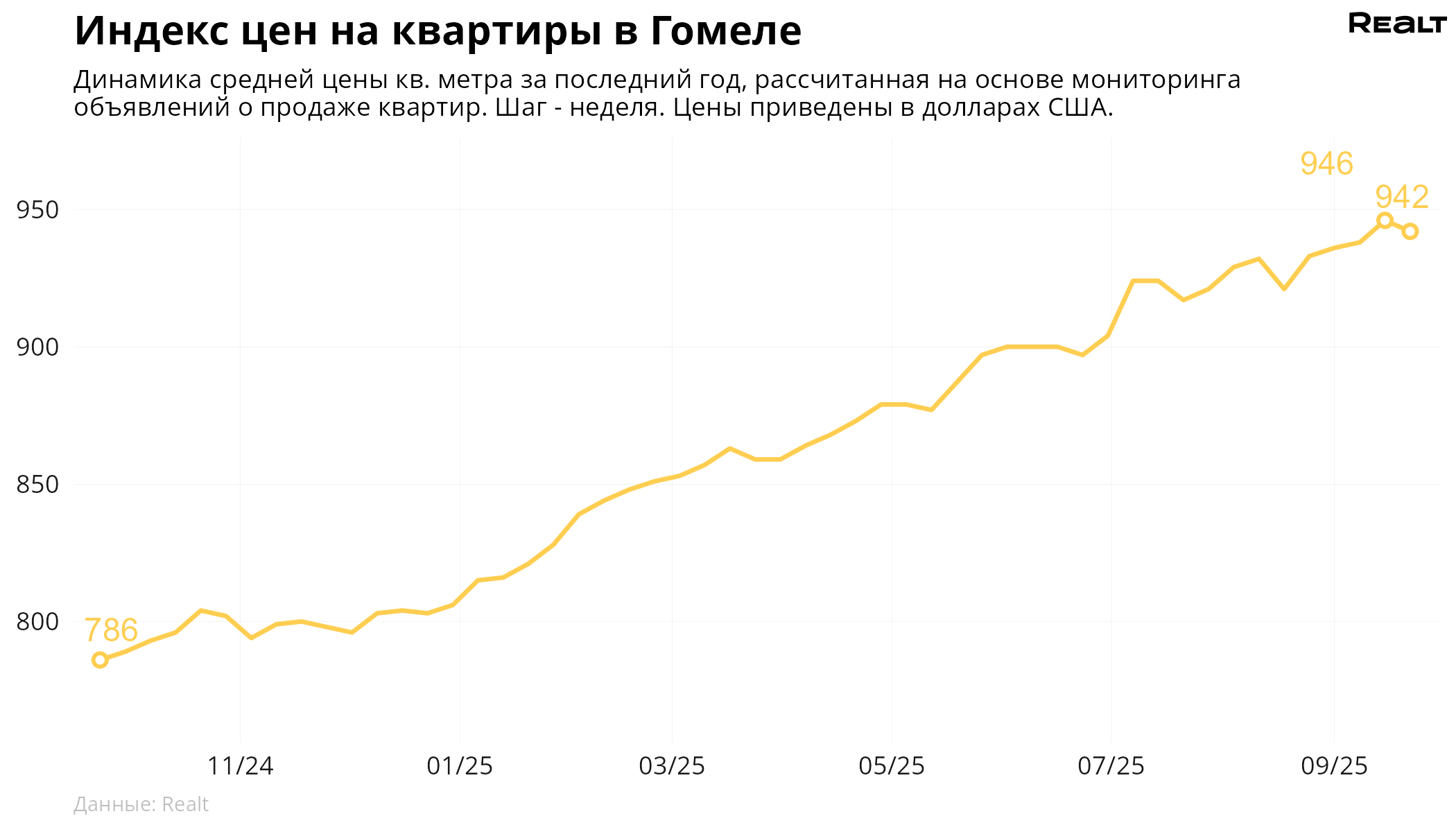 За неделю, с 15 по 22 сентября 2025 года, средняя цена в объявлениях о продаже квартир в Гомеле снизилась на 0.4% и составила 942 $/м2. При этом количество квартир в продаже уменьшилось на 1.5%. Что еще произошло на рынке жилья крупнейших городов Гомельской области за семь дней — в материале.