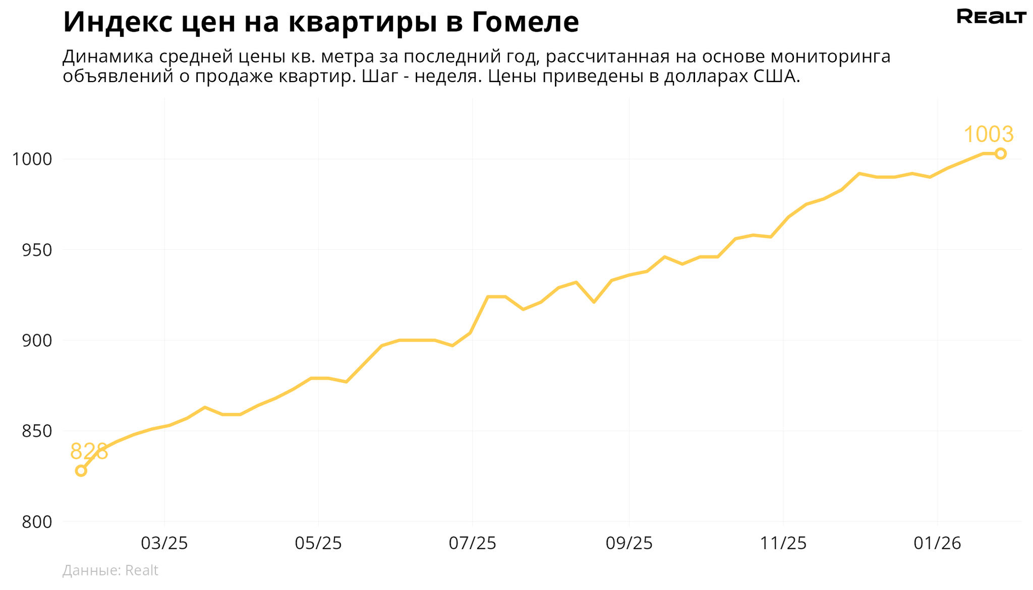 За неделю, с 19 по 26 января 2026 года, средняя цена в объявлениях о продаже квартир в Гомеле не изменилась и составила 1003 $/м2. При этом количество квартир в продаже уменьшилось на 1.3%. Что еще произошло на рынке жилья крупнейших городов Гомельской области за семь дней — в материале.