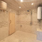На полу в жилых комнатах доска сосна лакированная, а в кухне, санузле и хоз. помещение плитка. Санузел с душевой кабинкой, все в отличном состоянии. На участке есть баня 2018г постройки (парилка с камином, моечная, раздевалка), плитка итальянская, пол в раздевалке с подогревом. Также во дворе имеется гараж. Терраса утепленная, обшита вагонкой, окна на ней стеклопакеты.