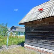 Участок размером 15 соток, на котором расположены сруб бани, большой гараж, мастерская, теплица, сарай и плодовые деревья.