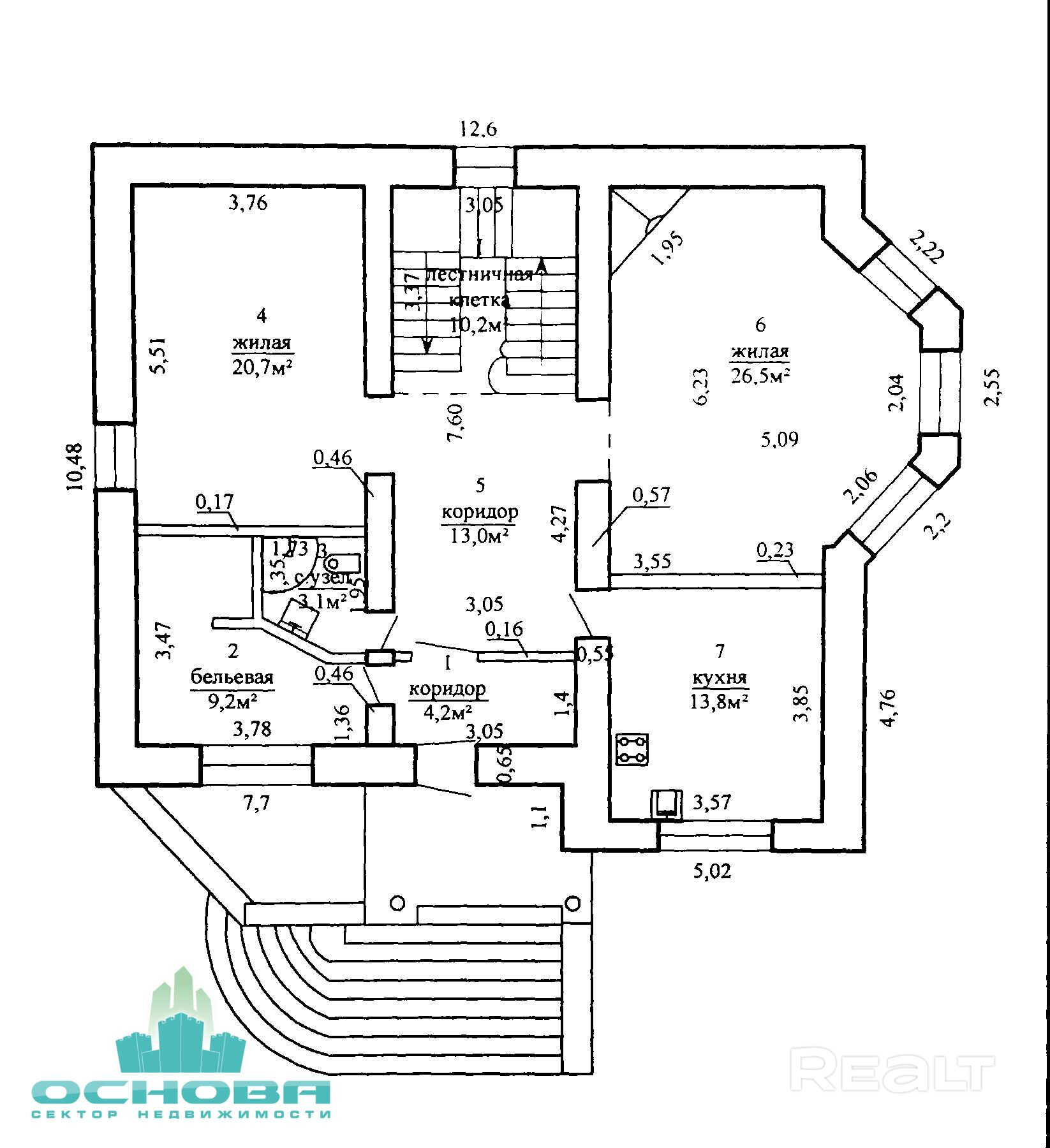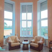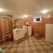 На первом этаже дома расположены кухня, гостевой зал, постирочная, санузел с душевой кабиной и большой зал с эркерными окнами, высотой в два этажа. В зале есть камин. На втором этаже находятся три спальных комнаты, два санузла с ванной и гардеробная. В одной из спален есть выход на балкон с видом на улицу. На третьем, мансардном этаже, есть рабочий кабинет с комнатой отдыха, спортивно-игровой зал и гостиная с выходом на балкон (вид во двор). Цокольный этаж располагает в себе топочную, кладовку, комнату под тренажёрный зал и большое помещение свободного назначения. Система отопления дома состоит из двух газовых котлов – основного и резервного. Все окна из ПВХ профиля. Канализация центральная.