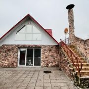 На первом этаже располагается прихожая, кухня-гостиная с выходом на террасу, спальня с живым камином, санузел с душевой комнатой, а также современная баня с комнатой отдыха. Из бани можно попасть на задний дворик с мангальной зоной.