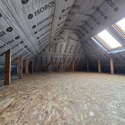 На первом этаже предусмотрены три жилые комнаты, просторная кухня, совмещенная с гостиной, бытовые помещения, раздельный санузел. Второй мансардный этаж пока без перегородок (установлены пять мансардных окон).