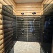 На первом этаже расположены кухня, гостиная, санузел топочная и баня с парилкой, душевой и комнатой отдыха.