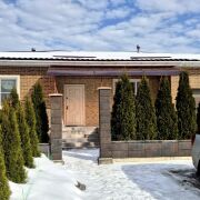 Перед домом посажены декоративные растения (туи). На самом участке растут уже плодоносящие плодово-ягодные деревья.