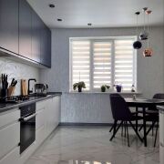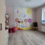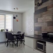 Стены – в комнатах оклеены обоями, отдельные зоны в общей комнате выделены декоративным кирпичом, в кухне - плиткой.