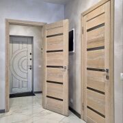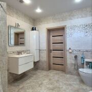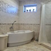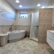 Пол – в комнатах уложен ламинат, в местах общего пользования – плитка (теплый пол).
