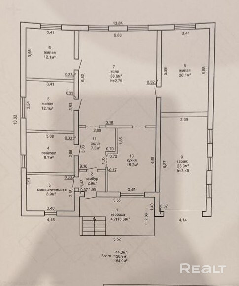 В общей планировке дома предусмотрен и обустроен гараж 23,3 кв.м. высотой помещения – 3,46м.