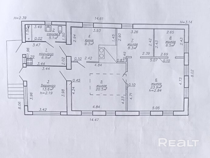 Дом кирпичный, площадью 68,5 м2., жилая 59,2 м2., кухня 9,3 м2. В доме четыре жилых комнаты, проходной зал, кухня, прихожая и веранда. Санузел в доме. Отопление паровое и печное (по улице вблизи дома проходит газ), вода на улице. Дом требует ремонта.