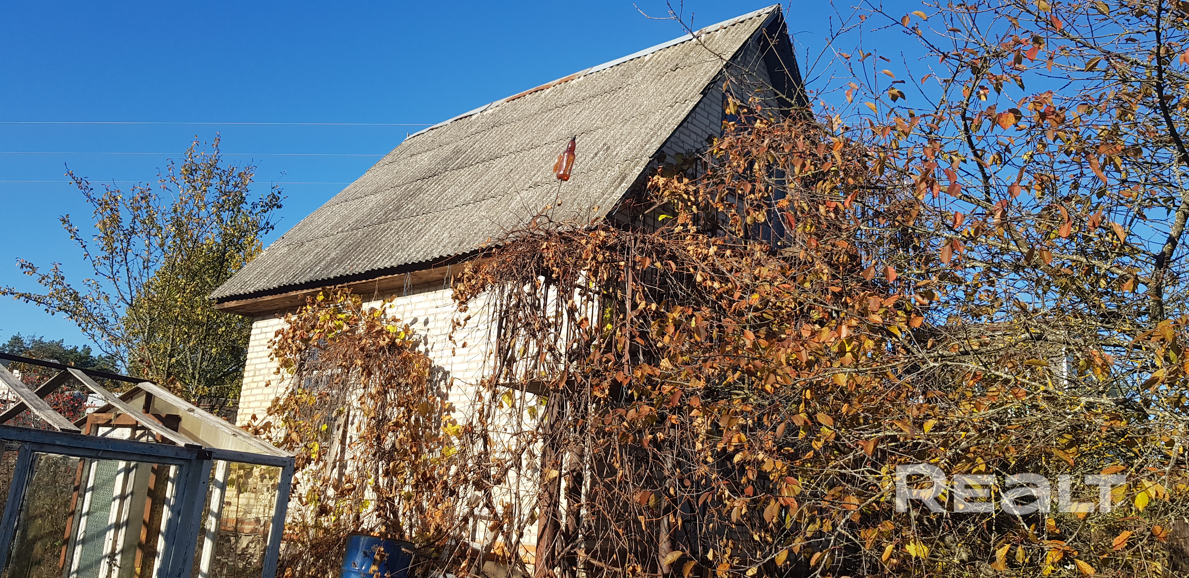 Дом с мансардой, погребом (4 м2), сараем, теплицей, садом и большим виноградником. По всему участку проведен полив. Участок около леса. Активное транспортное сообщение, остановка автобуса в 50 метрах от участка.