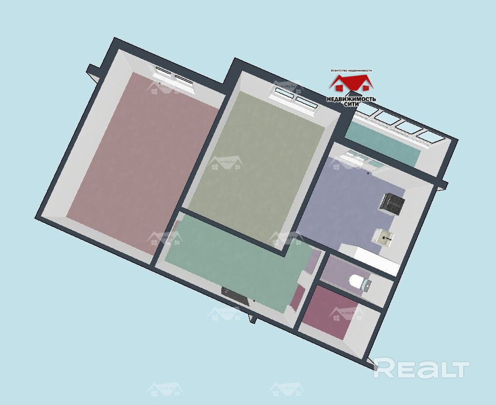 Общая площадь составляет 63 кв.м. (по СНБ 66 кв.м.), жилая 36.9 кв.м., кухня 10.5 кв.м.