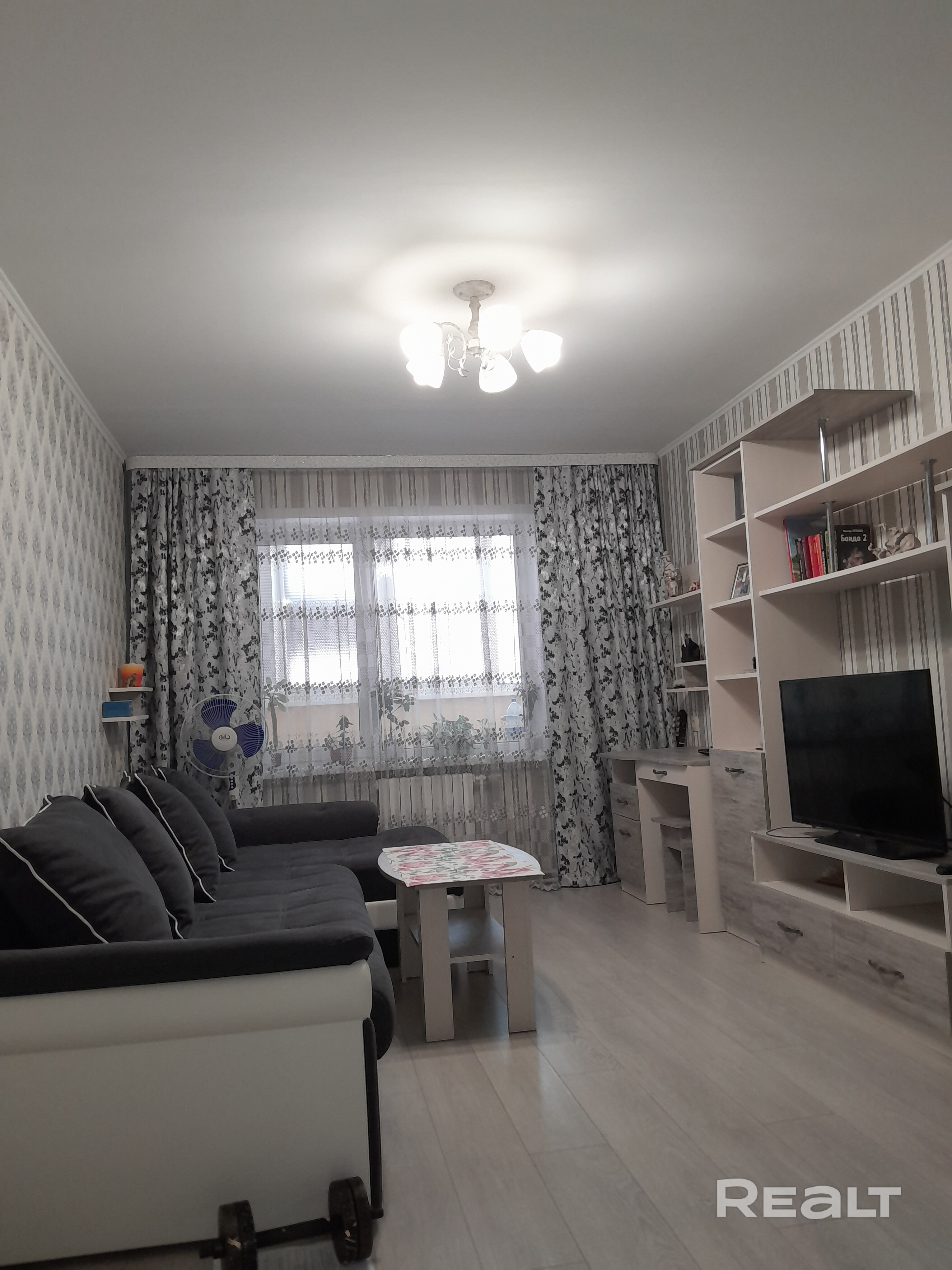 Просторная 1-комнатная квартира (полуторка) с ремонтом, мебелью. Полощадь по СНБ 46,5 м.кв., фактически 51. Квартира находится всего в 20 м от автобусной остановки. Очень удачная планировка с довольно большой кухней, прихожей, кладовой, в которой утстроена гардеробная. В квартире в комнате, коридоре на полу уложен ламинат высокой прочночти. Кухня, ванная, частично коридор возле входной двери - плитка. Стены оклеены обоями. Потолки окрашены.