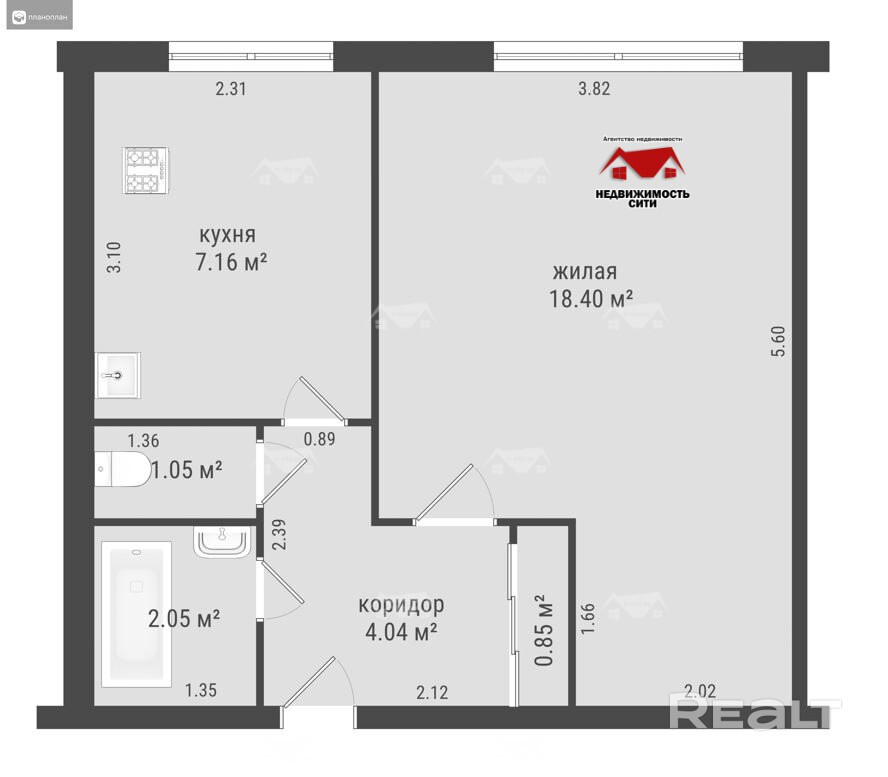 Общая площадь квартиры составляет 33.5 кв.м., из которых 18.40 кв.м. жилая площадь и 7,16 кв.м. кухня.