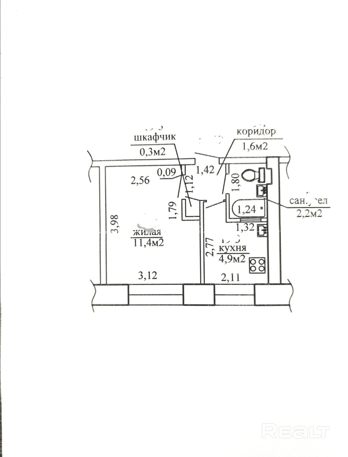 Общая площадь 20,4м, жилая - 11,4м, кухня - 4,9м.