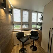 - Балкон (лоджия) утеплен и оборудован зоной отдыха с барными стульями.