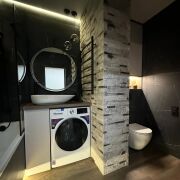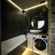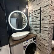 - Санузел отделан плиткой с имитацией камня, установлена современная сантехника, стиральная машина встроена в мебель.