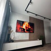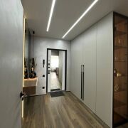 - Потолок — натяжной с встроенной точечной и линейной LED-подсветкой.