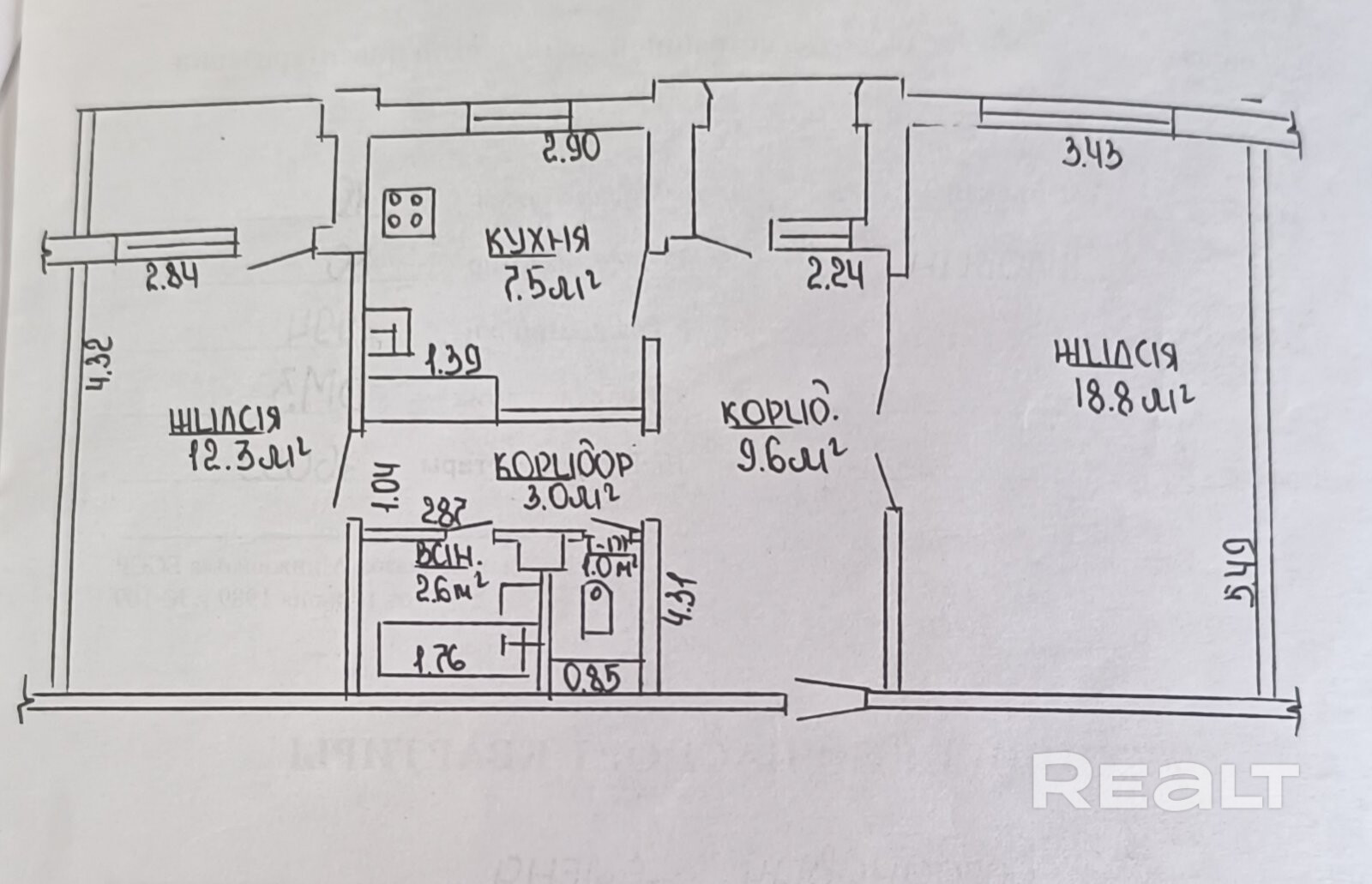 Общая площадь 54,8 м2, жилая площадь 31,1 м2, кухня 7,5 м2.