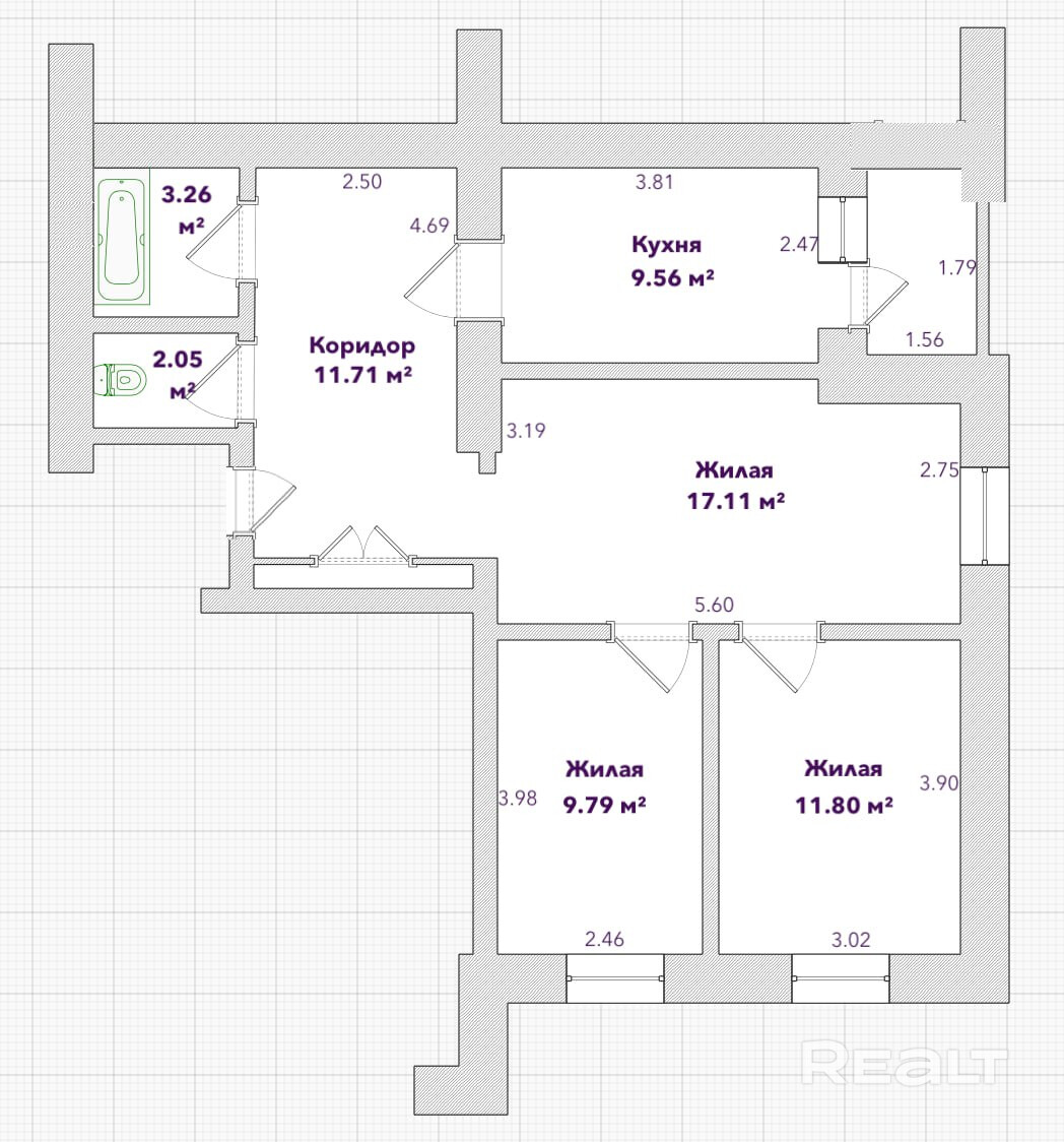 ̶ 3 комнаты (17,11 м2, 9,79 м2 и 11,80 м2);