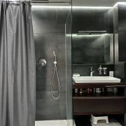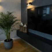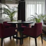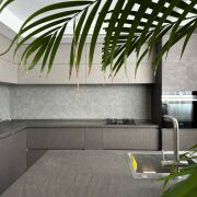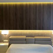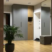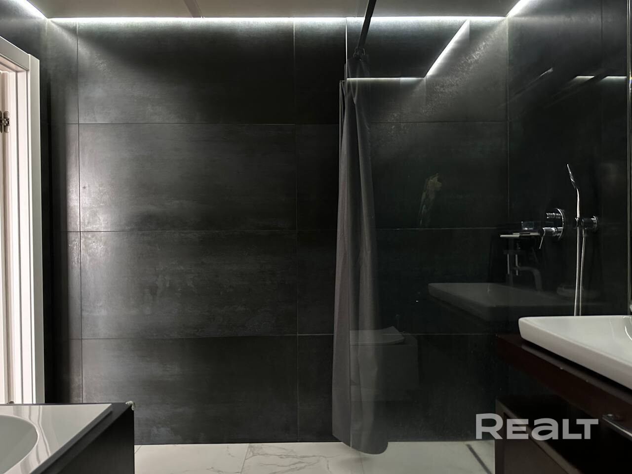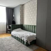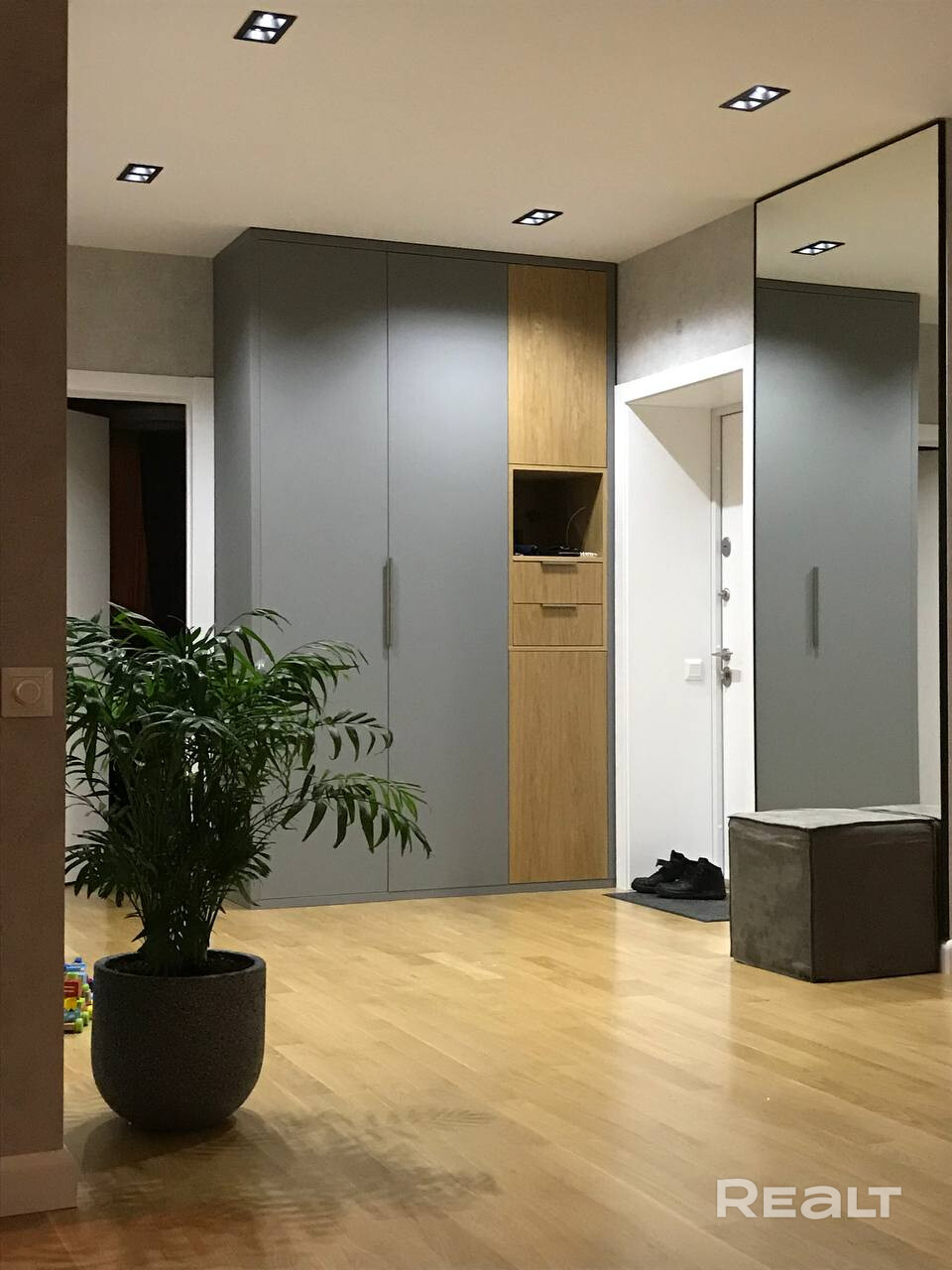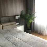 В квартире две спальни, одна из которых с гардеробной и балконом. Окна из спален выходят во двор, что обеспечивает полную тишину в комнатах. Гостиная совмещена с зоной для приготовления. В отдельно-стоящий остров кухонной зоны заведена вода для мойки и посуомойки. Установлена система очистки и смягчения воды. Пол в спальнях выполнен паркетной доской, потолок из гипсокартона.