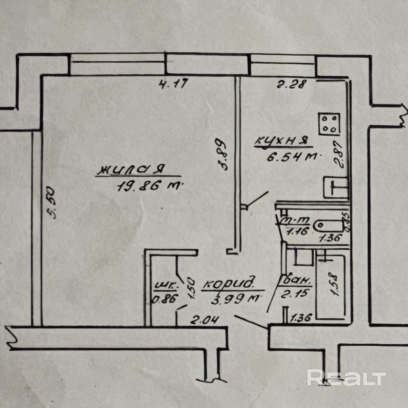 Общая площадь 34,56м2, жилая 19,86м2, кухня 6,54м2.