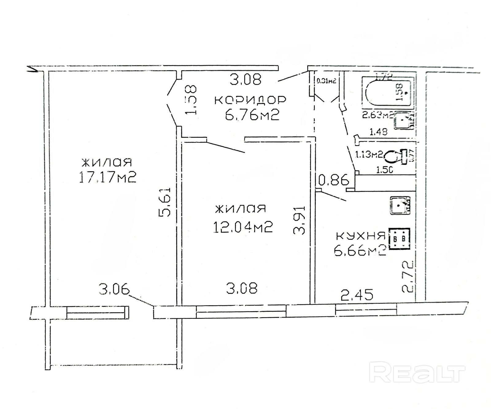 Общая площадь данной квартиры – 46.7 м.кв. Жилые комнаты – 17.2 и 12 м.кв.